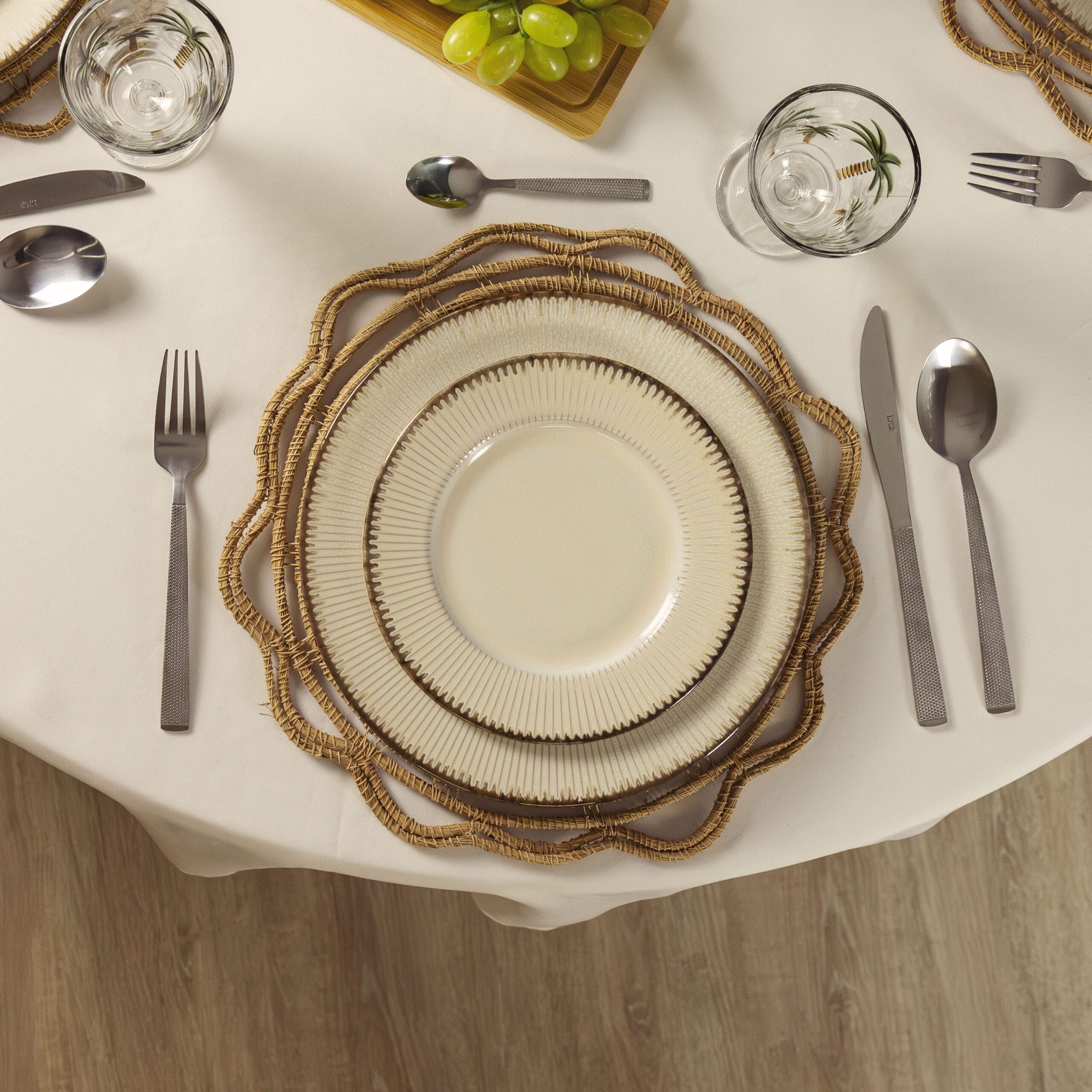 Elegante, versátil e atemporal, ele é perfeito para quem busca unir a neutralidade do branco com a modernidade das texturas, criando uma composição de mesa impecável.